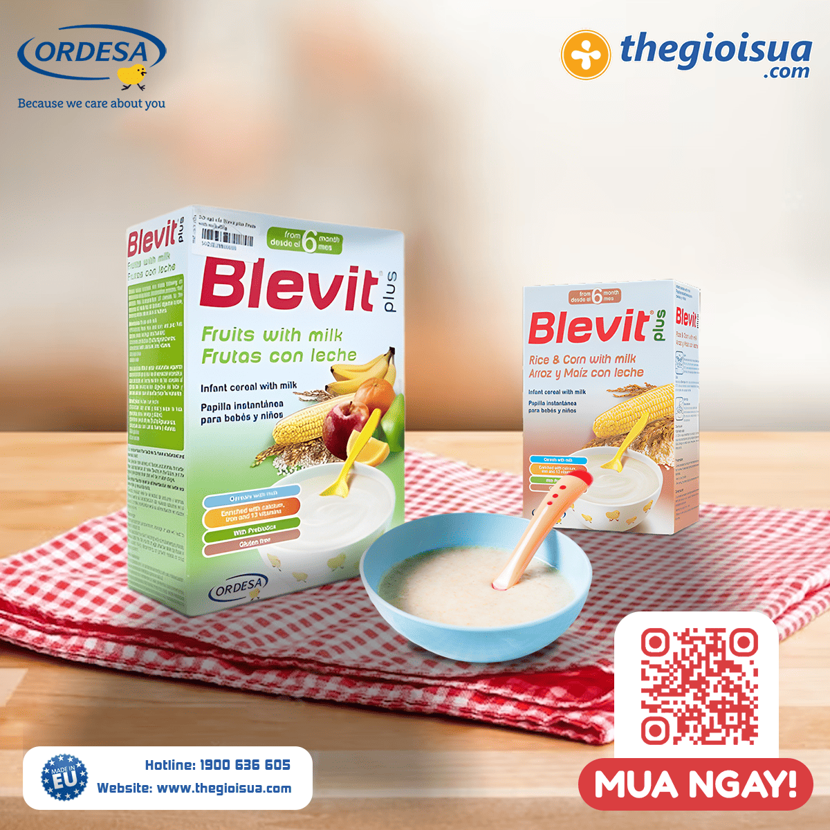 Bột ăn dặm Blevit xuất xứ từ Tây Ban Nha và đạt tiêu chuẩn quốc tế được bán trên một số quốc gia trên toàn thế giới. Bột ăn dặm Blevit được chế biến từ hỗn hợp ngũ cốc thủy phân, cung cấp hàm lượng chất xơ vượt trội, tăng cường vitamin và khoáng chất giúp đáp ứng nhu cầu dinh dưỡng và góp phần vào sự phát triển của trẻ.