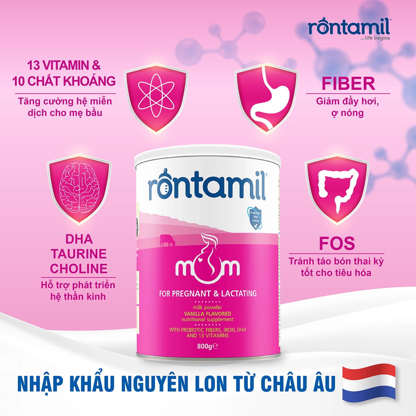 – 13 vitamin và 10 khoáng chất thiết yếu: bảo vệ và tăng cường miễn dịch cho phụ nữ trong giai đoạn mang thai và con bú.