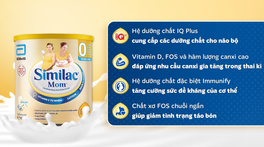 – Sữa bột Similac Mom hương vani với hệ dưỡng chất IQ bao gồm DHA, Acid folic, Choline và Sắt giúp phát triển não bộ và thị giác. Là nguồn dinh dưỡng tối ưu, tạo nền tảng sức khỏe tốt cho mẹ bầu và cung cấp các dưỡng chất thiết yếu giúp bé yêu phát triển khỏe mạnh ngay từ thời kỳ mang thai.